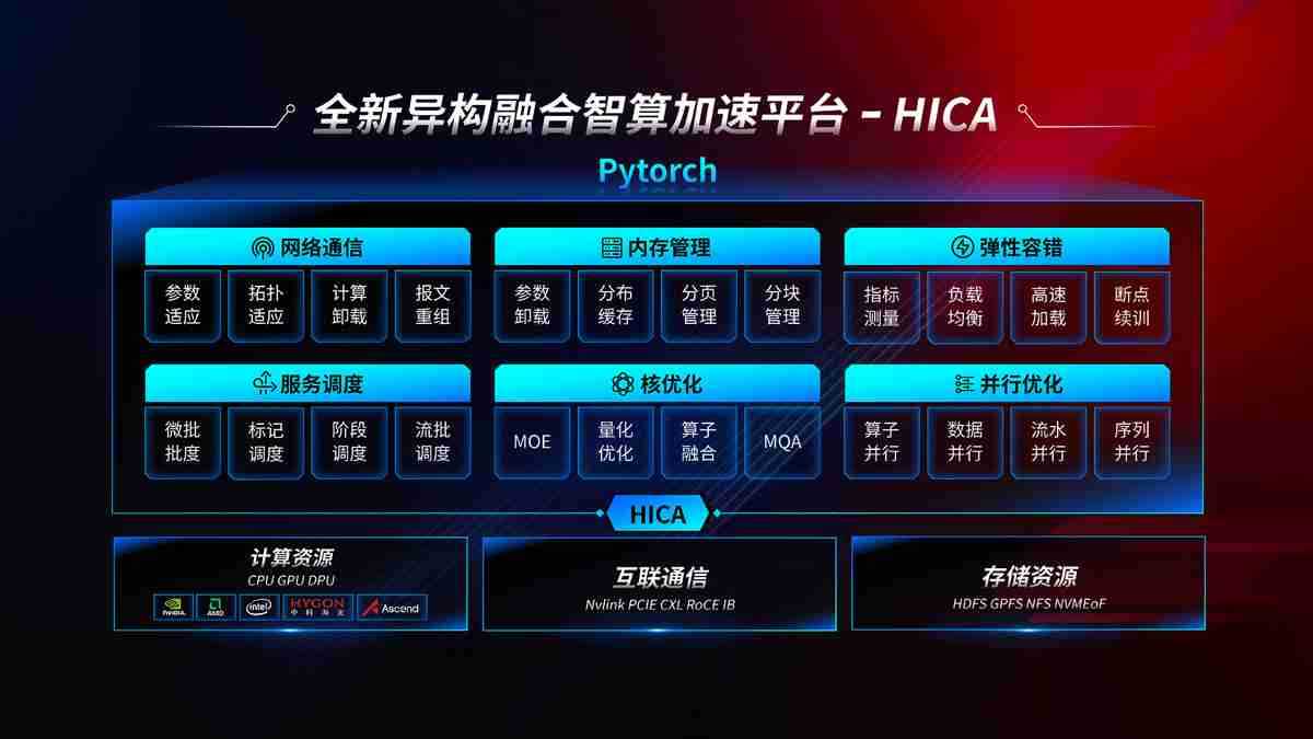 通过自研的服务层、、中间适配层、、、、以及调度编排算法,,,采用数据并行、、、模型并行等多种并行方式,,,把并行计算任务进行有效的分解,,使其分别由相应的软件栈和算力资源来承接。。当GPU资源变化,,,,HICA可以实时动态调度计算子任务并调整模型拓扑和架构,,,以充分聚合各种算力资源。。