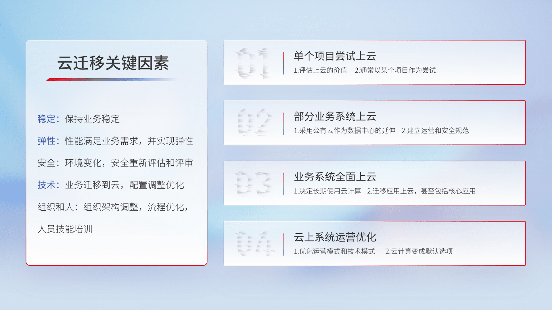 结合实际业务,,,从规划设计、、云平台选型、、云原生改造、、、、数据迁移、、、、集成交付,,,迁移全过程为客户识别最佳上云路径,,,做好风险识别管理,,,设计网络架构、、、、身份权限、、、、安全审计合规、、、操作审计、、、日志审计、、、、监控告警策略、、、、多站点容灾设计等,,对云上基础设施进行整体规划,,,,提升IT治理水平,,,以满足弹性、、、高可用、、、、高性能的需求。。。