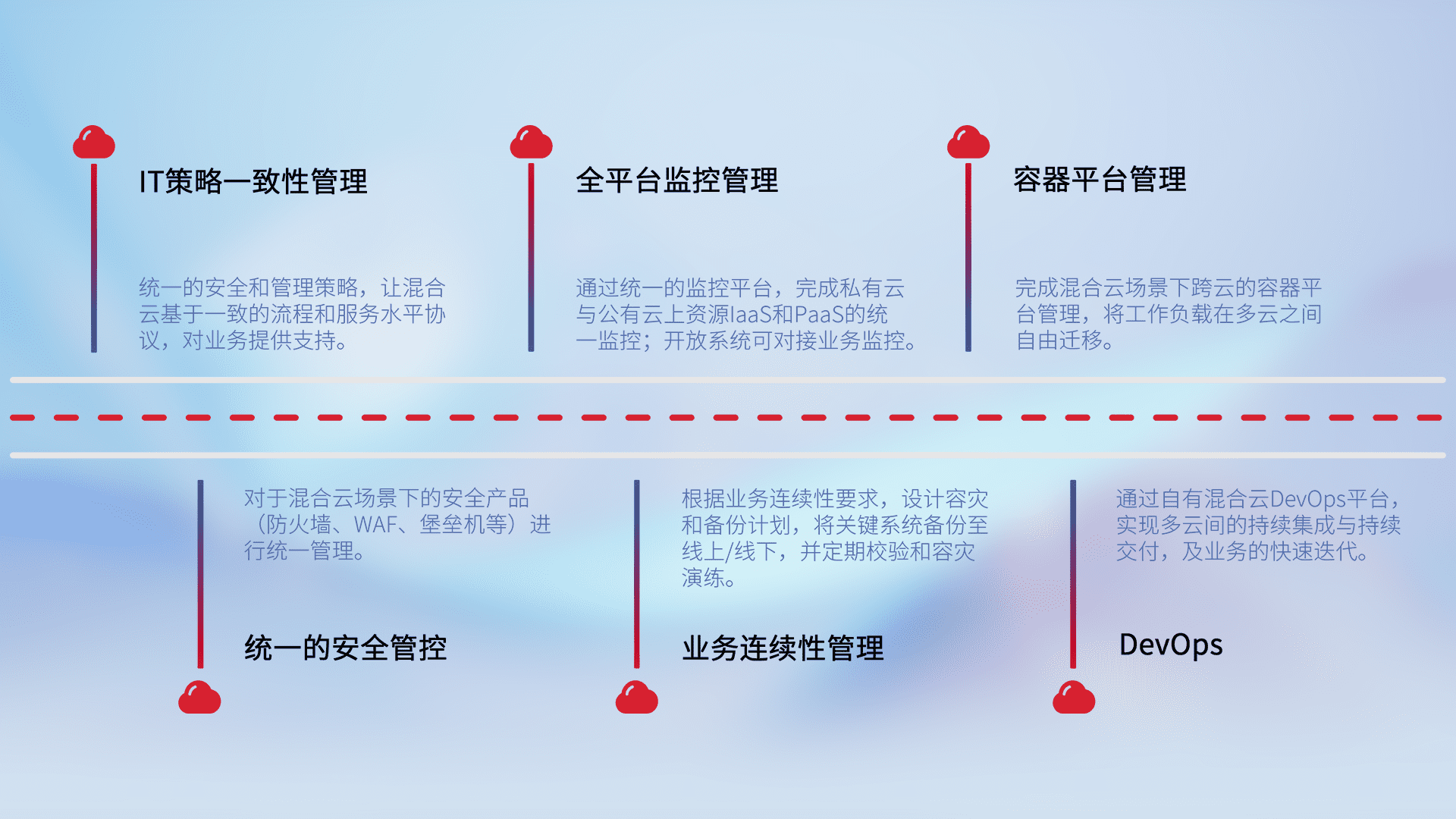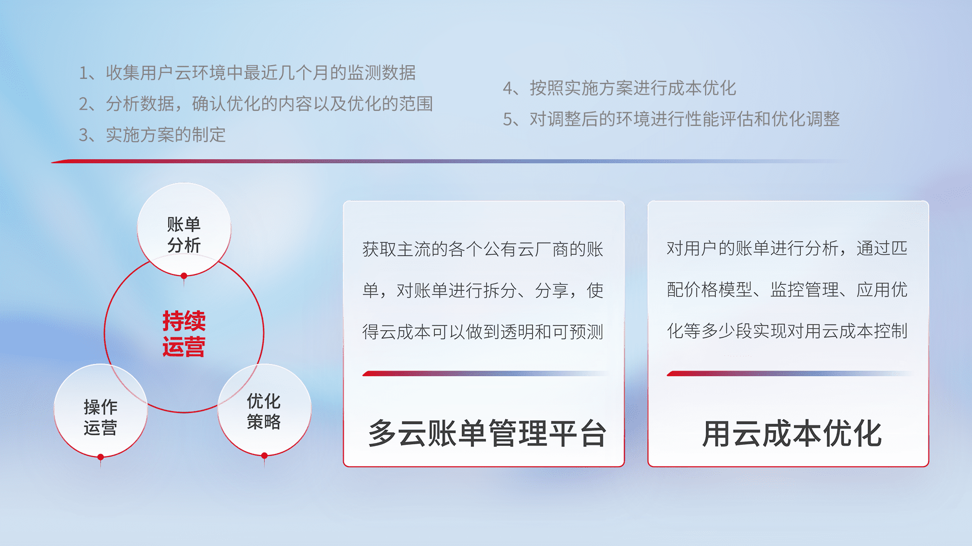 通过多云纳管,,以统一的资源数据模型把客户的云资源进行抽象和封装,,,进而实现对多云资源的统一操作,,保障云资源管理的可靠性、、稳定性与可用性。。量身定制化运维内容,,,配置、、、、开发运维、、补丁管理、、备份、、、监控、、、认证和访问管理、、审计和日常巡检等,,保障在用云过程中的可靠度,,,稳定度以及高可用率。。。。