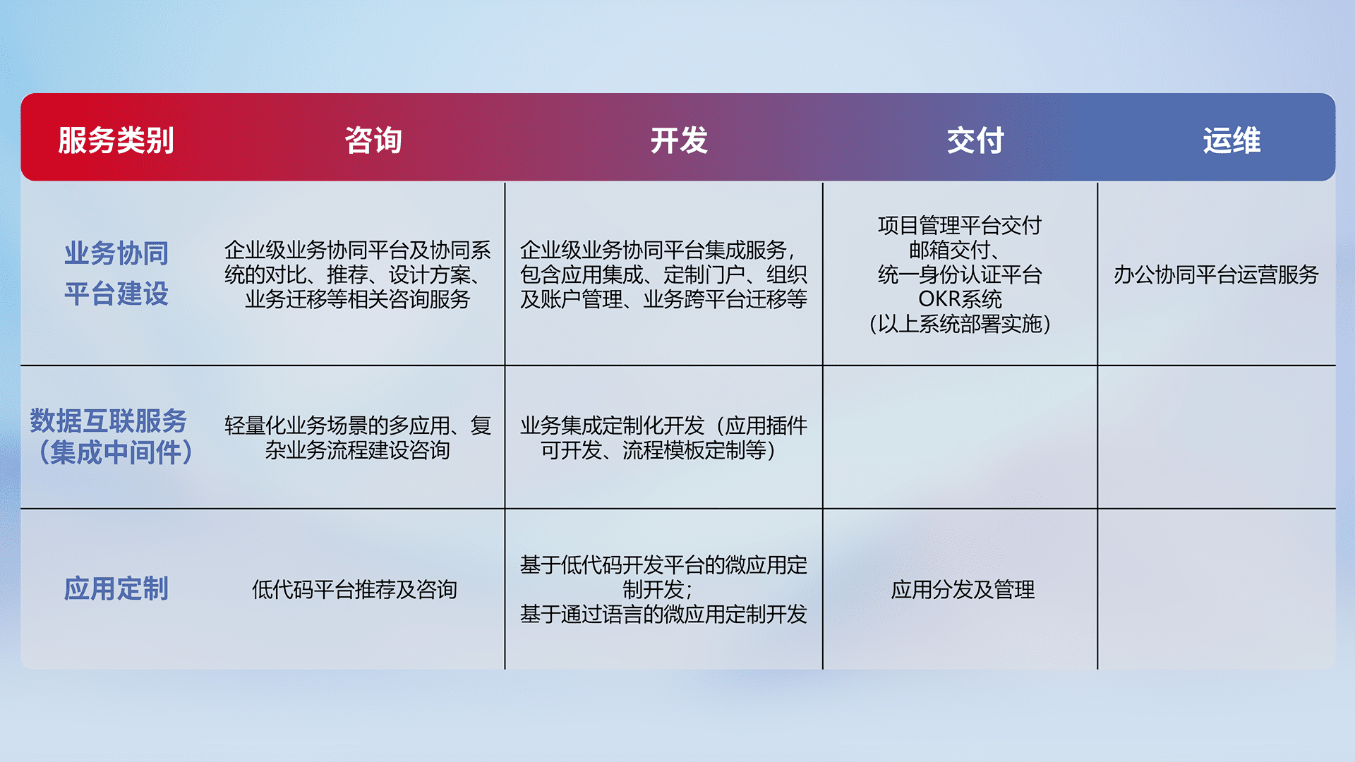 针对钉钉、、、企微、、、、IDaas等平台级产品提供产品的规划、、方案、、、交付、、定制化开发等服务,,实现如统一协同办公、、、智能客户服务、、混合会议管理、、智能数据查询、、、、等业务场景,,实现数字化转型。。。。